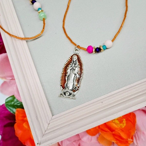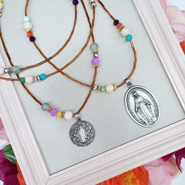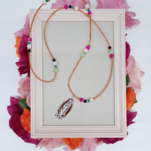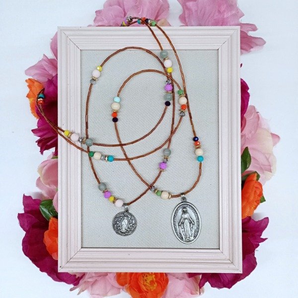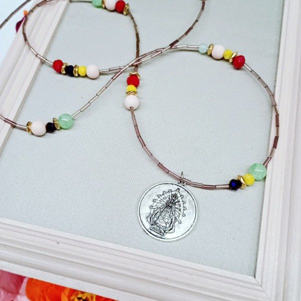 Collar largo de base de canutillos muy brillantes intercalados con piedras y cristales. En la base dije religioso extra grande