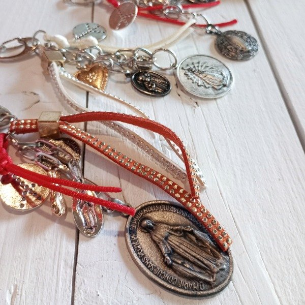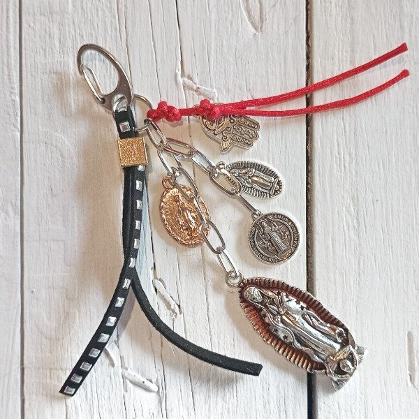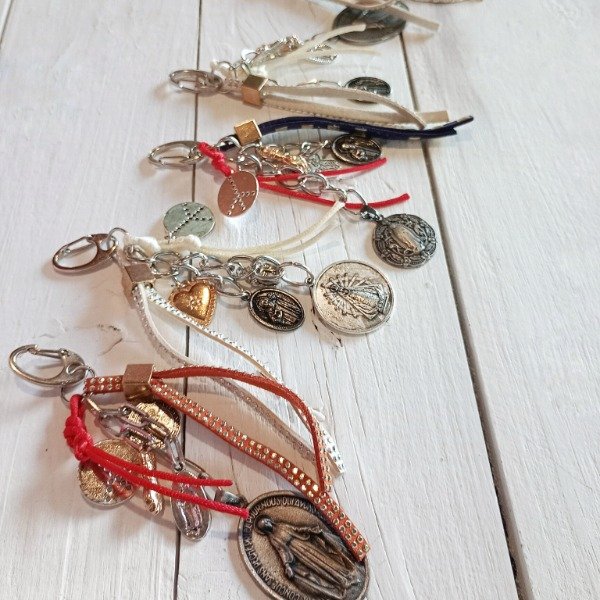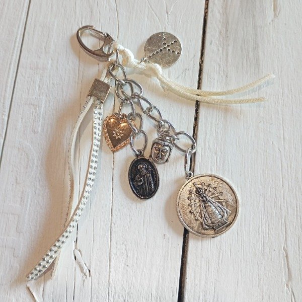 Llavero de cadena plateada repleta de dijes/amuletos. En la base dije extra grande religioso, acompado de otros medianos.