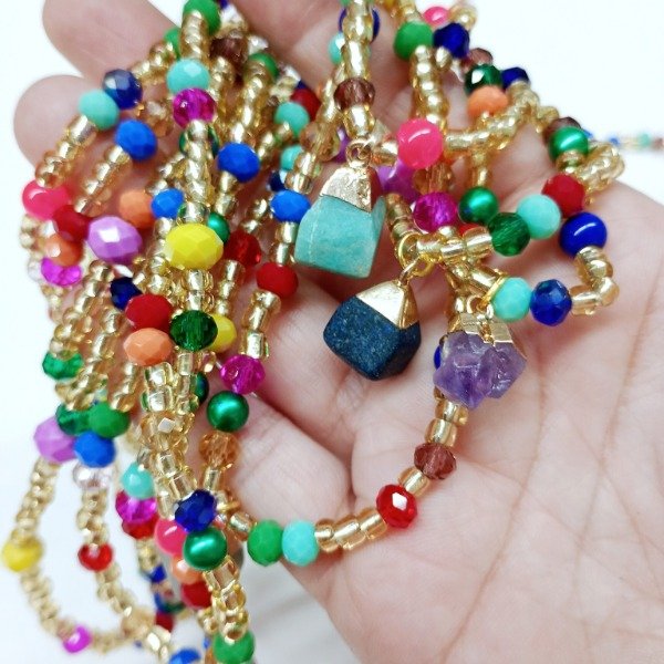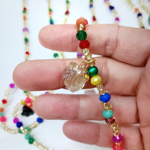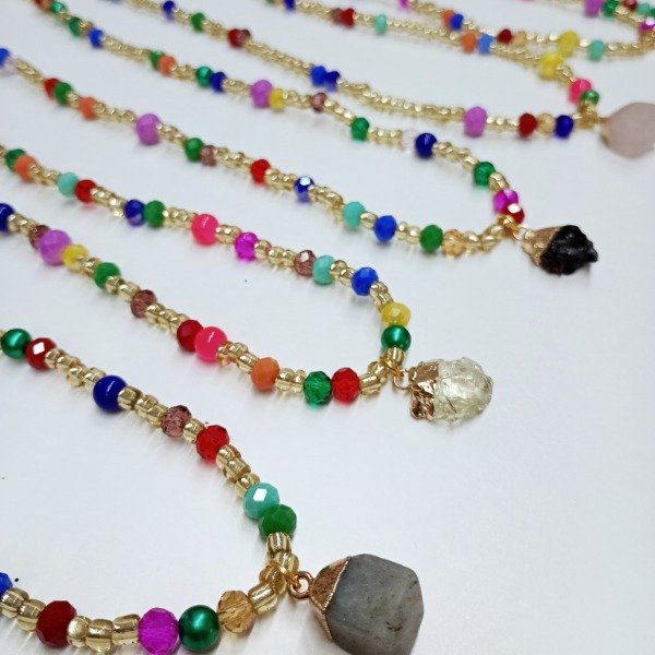 Collar de largo medio, de base elastizada. Mostacillones color caramelo intercalados por cristales de roca multicolor y en la base PIEDRA NATURAL ENGARZADA