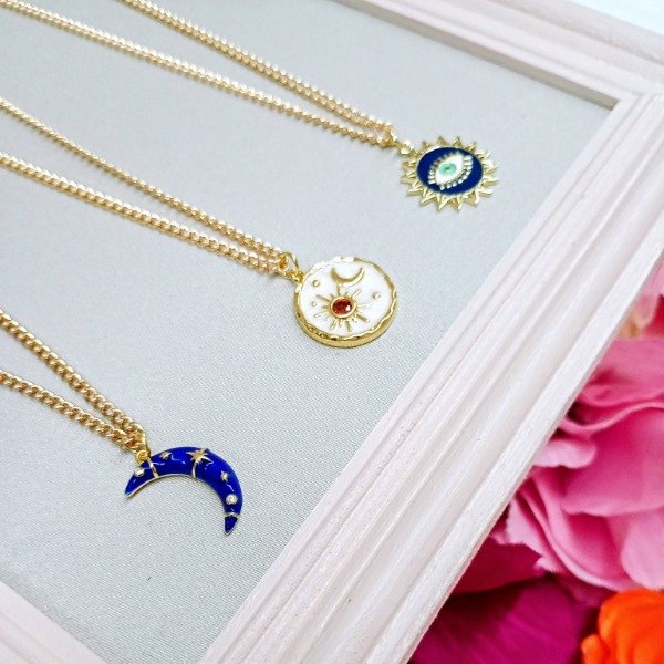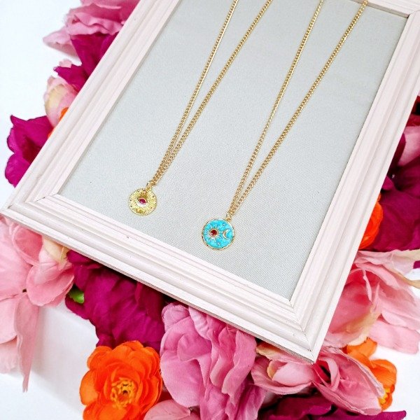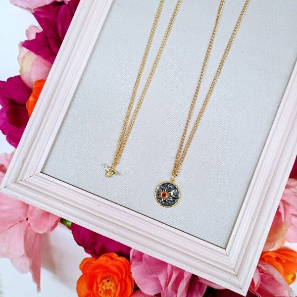 Collar de cadena fina dorada con dije de metal esmaltado o con strass en la base.