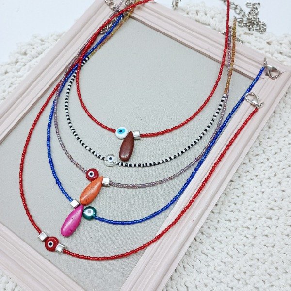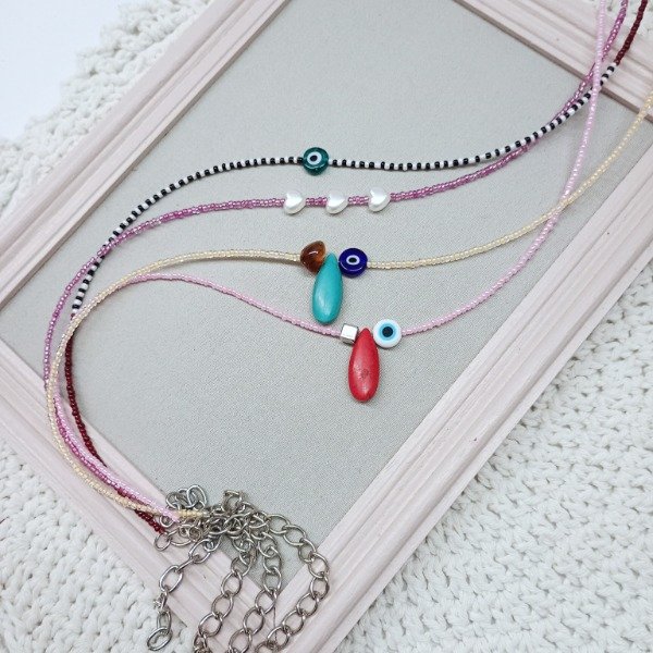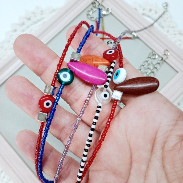 Hecho de mini mostacillas de colores combinado en la base con distintas cuentas pasantes, como ojitos de vidrio, corazones perlados, piedras, estc