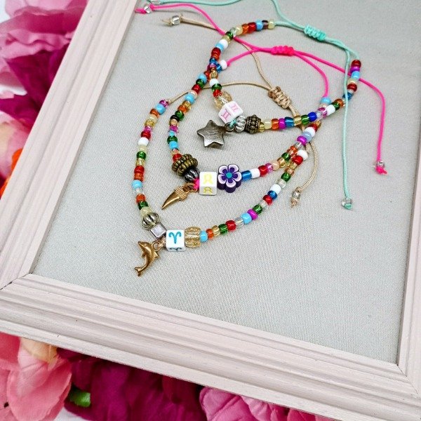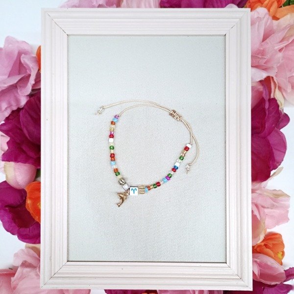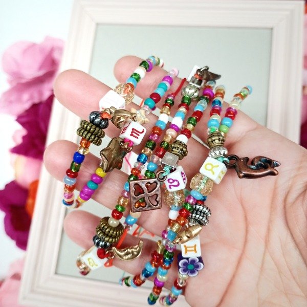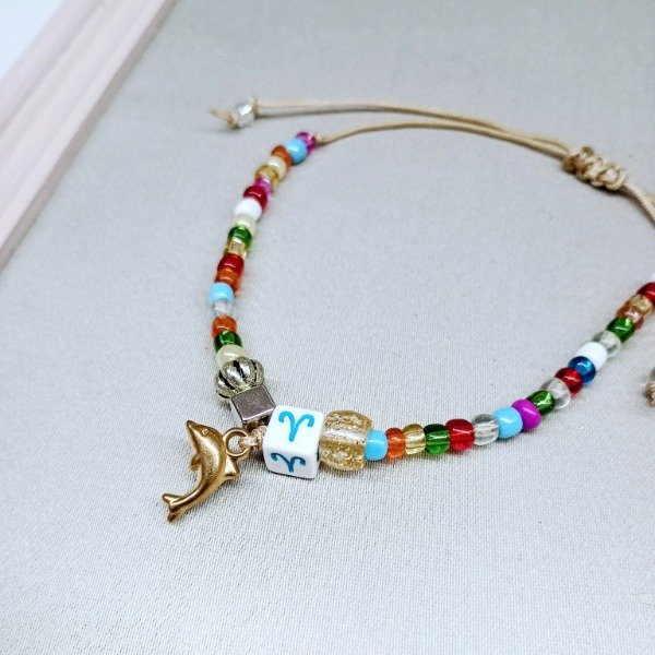 Tobillera de base de hilito regulable con mostacillones multicolor + piedra ZODÍACO pasante + piedras y dijes