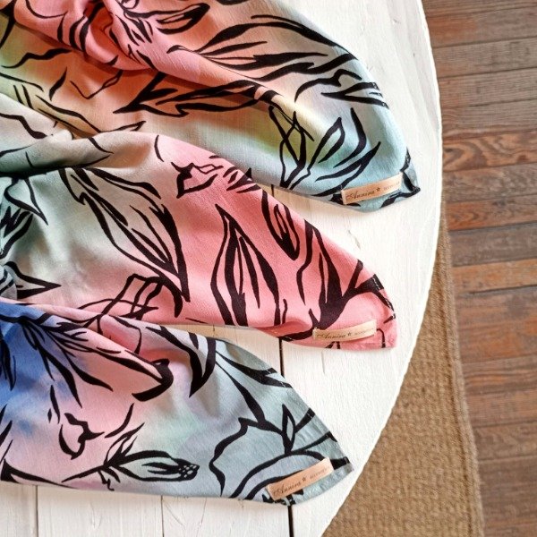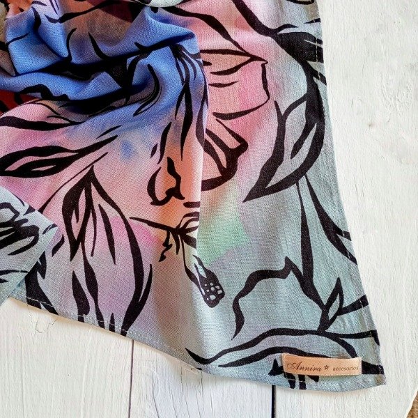 Pañuelo de lino extra suave estampado abstracto en color negro y teñido artesanalmente en varios colores formando arcoiris y efectos de combinación de colores.